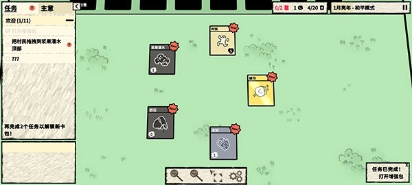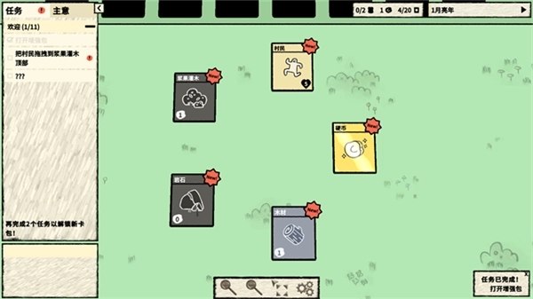 4、一共获得了木材、浆果灌木、村民、岩石以及硬币五张新卡牌,按照左侧的任务要求,移动这些卡牌。