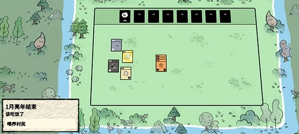 6、随着游戏的进行,1月亮年结束后就会出现吃饭提示,点击“喂养村民”就会消耗你的浆果卡牌,维持村民的生命。