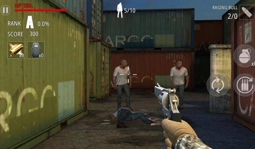 2、摇杆控制人物行走,右下角的虚拟键可以攻击,当子弹没有的时候会自动更换弹夹