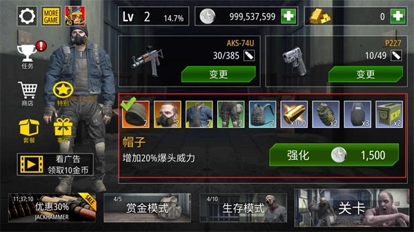 4、击杀僵尸赚取的金币可以用来购买新的强大的武器和道具