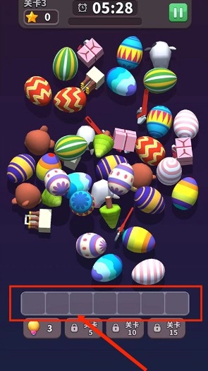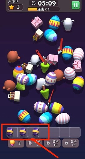 当三个一模一样的物品被放置到方块区域内时,它们便会自行消除。