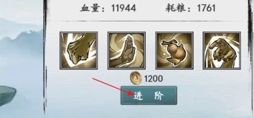 5、接下来,我们继续点击侠客金毛狮王修炼下方的进阶按钮。