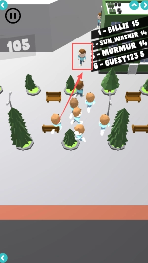 2、滑动屏幕操控角色移动,靠近白色小人即可将其吸纳进队伍,需在15秒内快速集结更多成员。