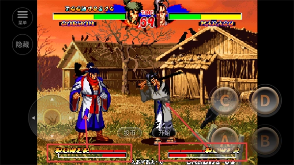 2、战斗过程中操控角色时,需结合方向键与【A】【B】【C】【D】键进行操作,同时要留意双方的【POWER】条变化来调整战术策略。