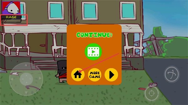 进入游戏后,首先留意左上角的【RAGE】状态;界面上的【CONTINUE?】按钮,既可以通过观看视频来继续游戏,也能选择其他功能选项。