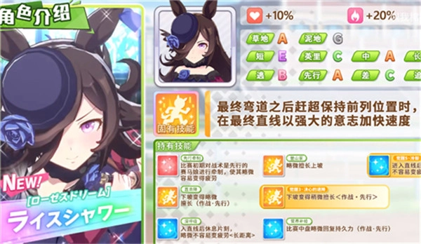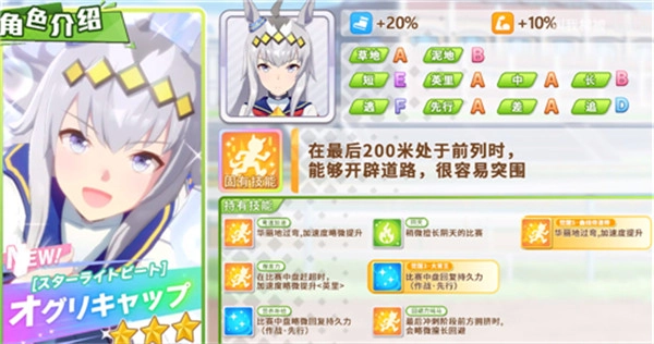 1、首先,如果你是动画党,完全可以根据自己的喜好来选择角色;要是你更看重强度,那**小栗帽**绝对是首选——她在草地和泥地赛道上都能发挥出色,除了短距离赛事外几乎全能,这意味着她能适配90%左右的比赛,实用性拉满。而且她的固有技能是终点前200米触发爆发冲刺,作为继承技能也相当好用。