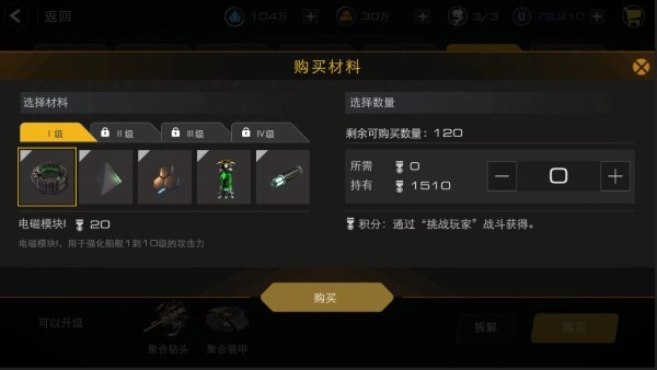 第二个途径是在仓库里用军衔积分购买。每天通过挑战其他玩家最多能拿到5000积分,而且军衔等级越高,能买的材料数量就越多,每天邮件奖励的积分也会更多。因此建议大家每天尽量把5000积分打满。