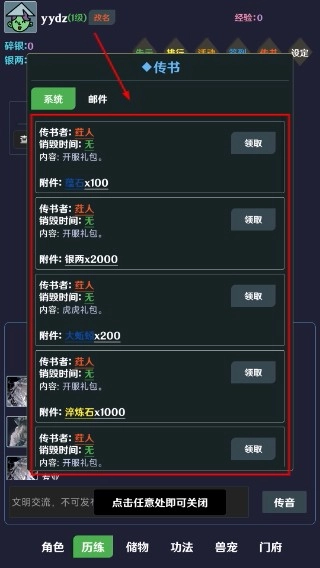 3、进入【传书】界面查阅系统邮件,领取【元宝】【银两】等附件奖励,助力快速积累初始资源。