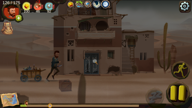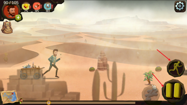 2. 历经一段过程动画后,便正式进入游戏。在游戏里,人物会自动向前行进,右侧设有按钮,可实现暂停操作或切换至跑步状态。