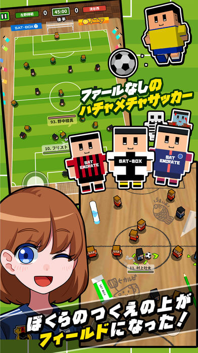 《桌上足球》(机でサッカー)是游戏商 SAT - BOX 推出的一款以校园为主题的模拟足球游戏。在游戏里,玩家能够操控可爱的角色,在学校的桌上展开足球比赛,通过按下操作键来完成传球或射门动作。即便你不懂足球,也能在练习模式中进行练习。此外,你还能在事件对战模式里与全国各地的玩家一较高下,该模式以一星期为一个周期。同时,游戏还有对战模式、排名模式以及经典对战模式等多种模式等你来挑战。而且,通过抽蛋还有机会获取新角色哦。