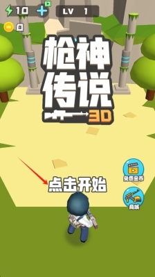 1、来到枪神传说3D的启动界面,点击“开始”,即可开启刺激的射击冒险之旅,点击屏幕就能正式开始游戏。