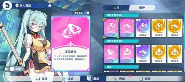 每个角色都具备独特的技能,技能类别涵盖普攻、主动技能、援护技能与绝招,它们是战斗里主要的输出与控制方式。核心潜能是角色关键的能力强化点,对战斗风格和实力起着重要作用。不同角色的核心潜能效果各有不同,在进行爬塔时,确定主控角色所属流派后,要尽量多挑选同流派的潜能。