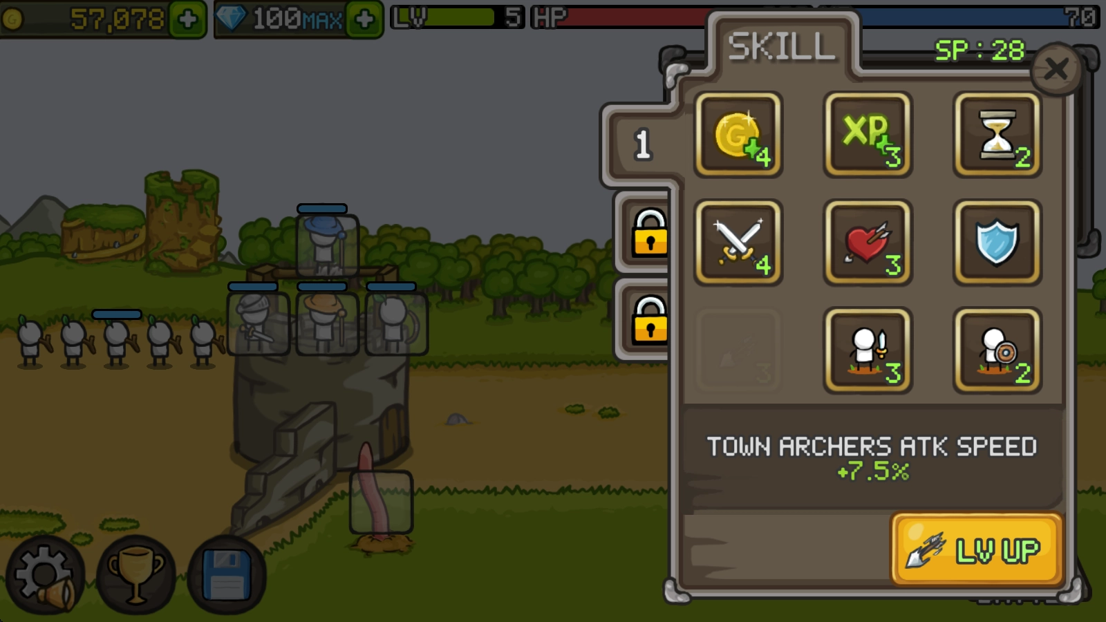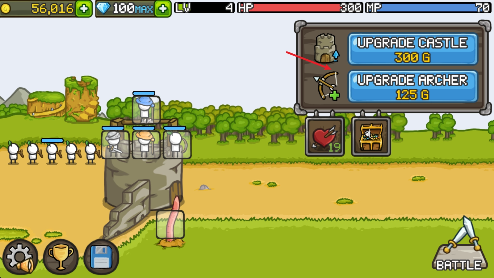 点击battle按钮后,战斗随即启动,我方英雄与身后的士兵会自动对出现的怪物发起攻击。