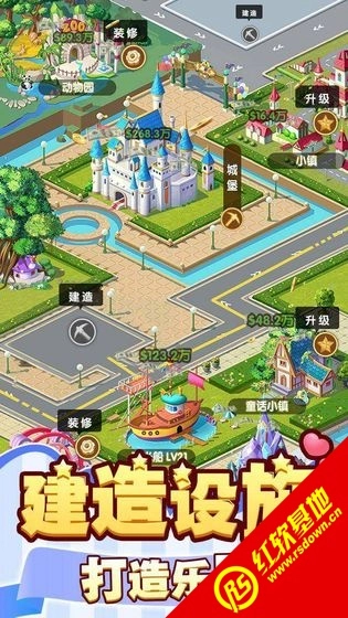 休闲名片开发:与您的伴侣一同模拟经营游乐园,通过运营赚取收益并获得小费。这里有城堡、观光船、童话屋等各式各样的建筑,充满乐趣。